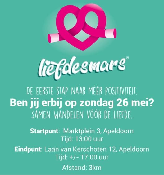 APELDOORN – De mars is (zoals de naam al doet vermoeden) echt vanuit liefde en positiviteit in het leven geroepen. Puur om de negativiteit, het vele tegen, protesten en anti-geluid een halt te roepen (al is het maar voor even).