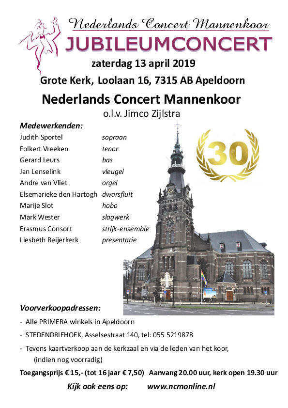 APELDOORN - Het Nederlands Concert Mannenkoor (NCM) bestaat 30 jaar en gaat dit vieren met een prachtig concert in de ‘Grote Kerk’ aan de Loolaan in Apeldoorn op zaterdag 13 april 2019.