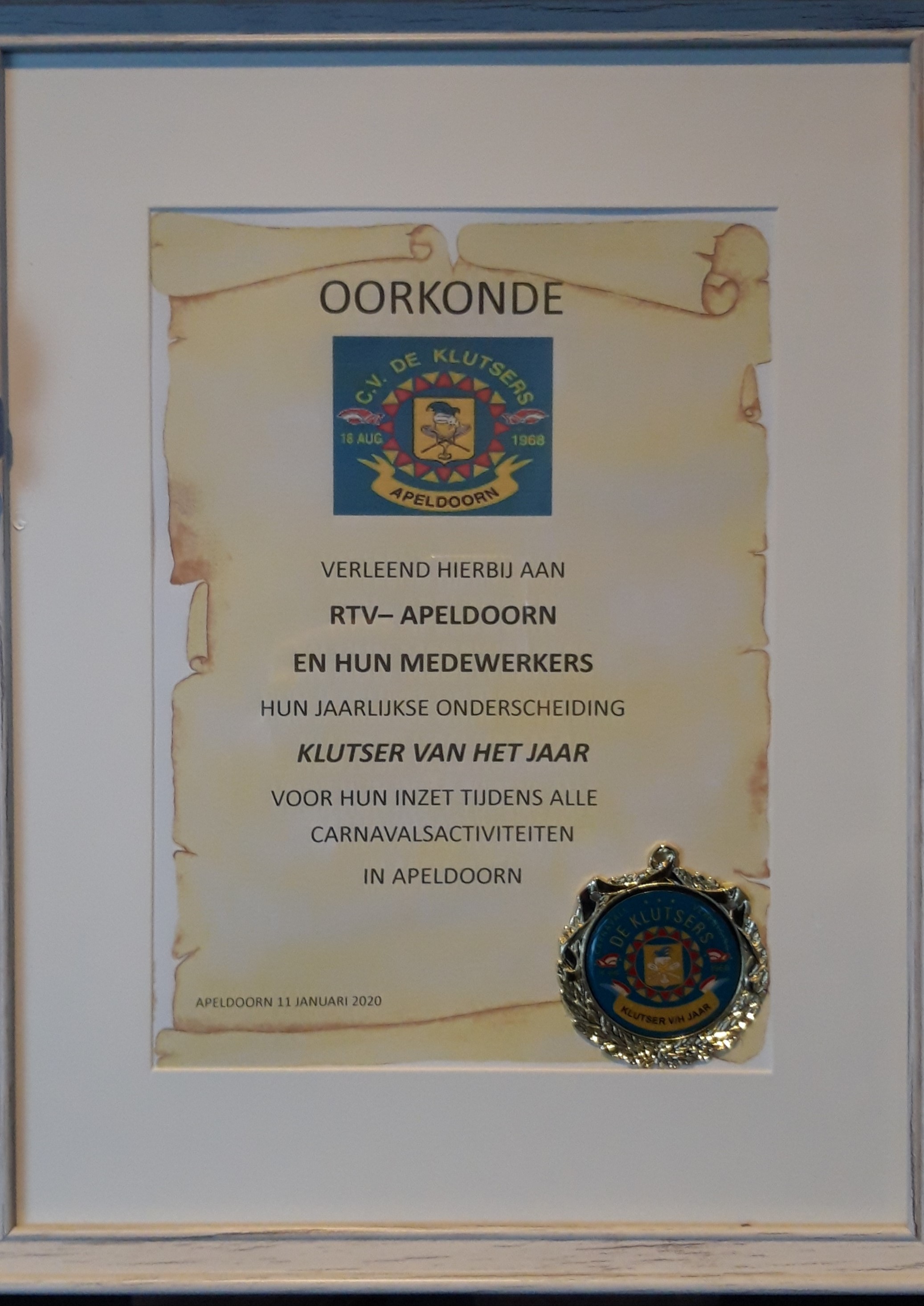 APELDOORN - Carnavalsvereniging de Klutsers heeft tijdens hun pronkzitting de jaarlijkse onderscheiding 'KLUTSER VAN HET JAAR` verleend aan RTV Apeldoorn.