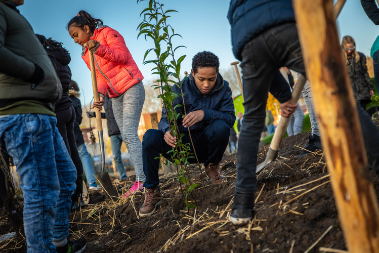 De verschillende soorten bomen trekken insecten en vogels aan. Ook krijgen kinderen de kans om de natuur in de buurt te ontdekken en daarover te leren. En een bos in een woonwijk zorgt voor een schonere lucht, voor verkoeling in de zomer, en het kan een opslagplek voor regenwater zijn.”