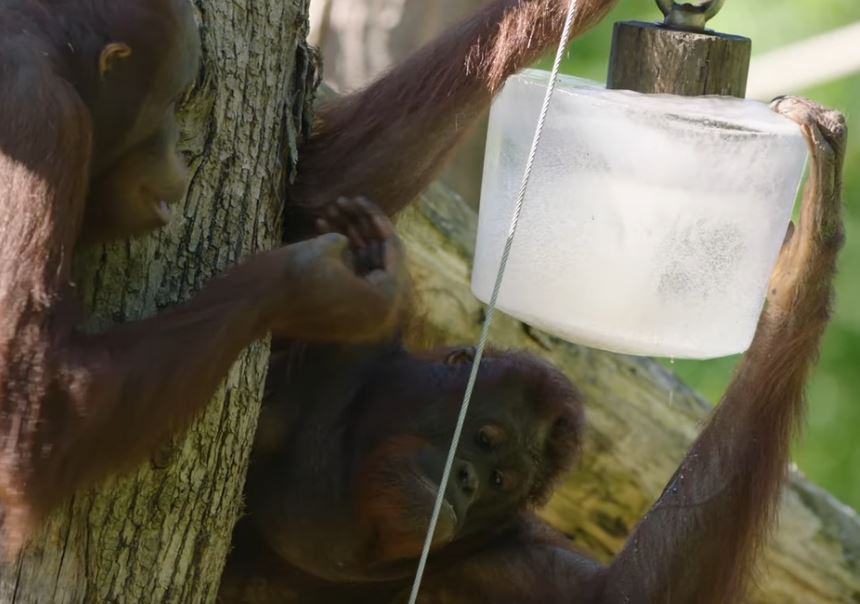 Niet eerder kregen de orang-oetans een ijsje van zo’n omvang. Het ijsblok is zo’n 20 bij 30 centimeter groot en weegt zeker 20 kilo. Orang-oetanverzorger Bianca legt uit: “Het wordt steeds warmer in Nederland. We moeten dus nadenken over andere manieren van verkoeling voor de dieren. Dat is nog niet zo eenvoudig bij orang-oetans, want deze apen zijn heel vindingrijk. Het zijn echte slopers die met alles wat los en vast zit aan de haal kunnen gaan.”