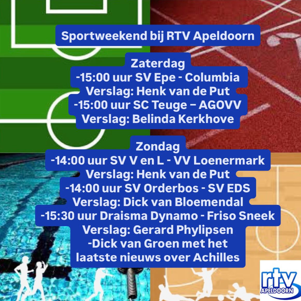 Het komende weekend bij RTV Apeldoorn, sport op zaterdag én zondag met verslag van weer verschillende wedstrijden. De verslaggevers gaan op pad en houden je op de hoogte.