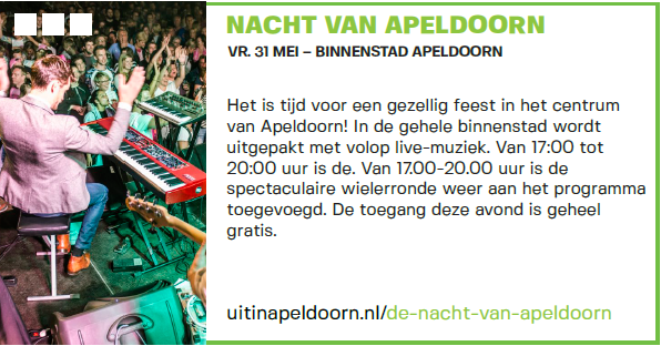 Voor alle evenementen, de actuele uitagenda en wat er nog meer te doen en te zien is in Apeldoorn, verwijzen we u naar www.uitinapeldoorn.nl