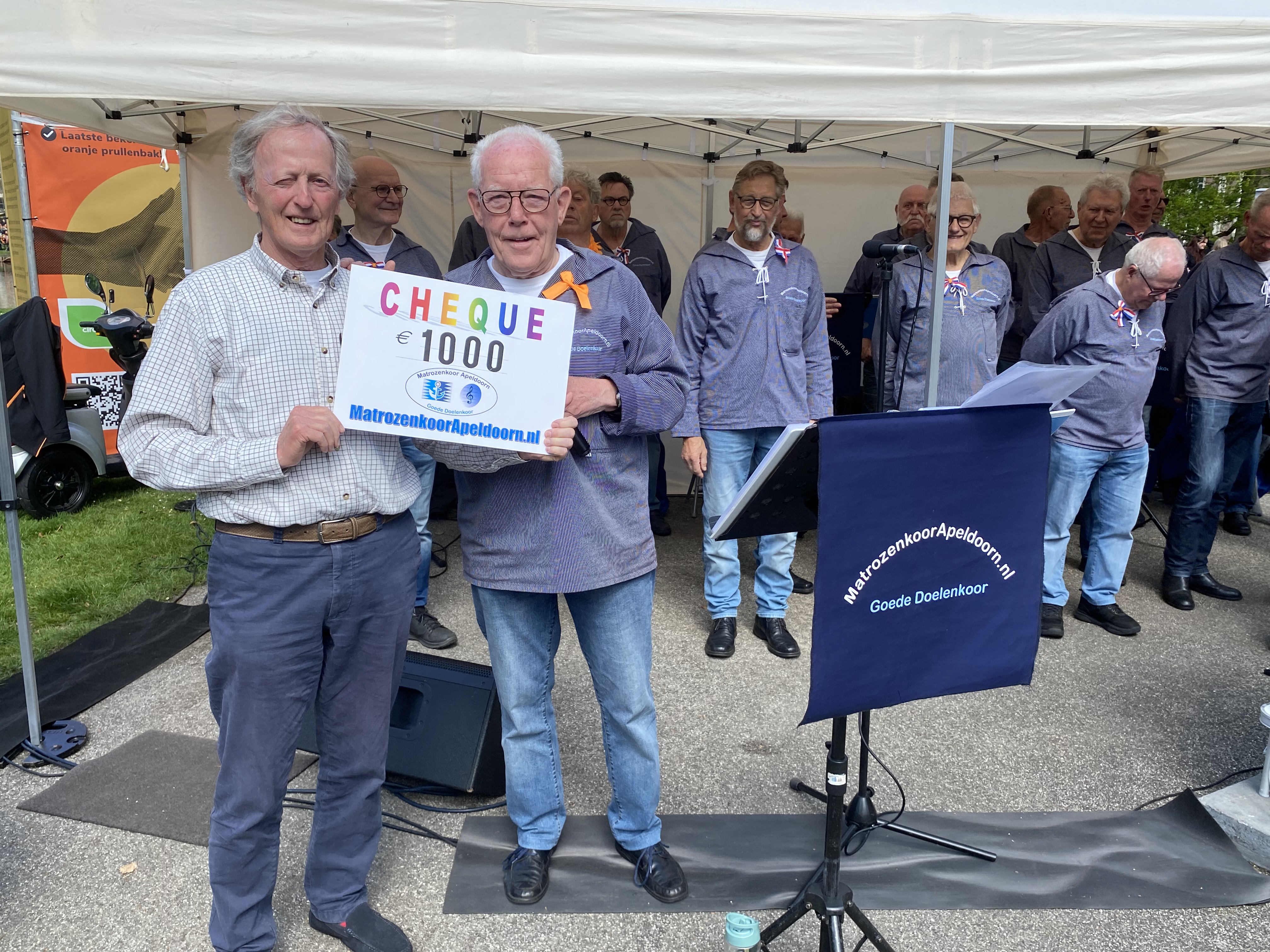 Op Koningsdag mocht onze voorzitter Arjan Speelman een cheque van 1000 euro in ontvangst nemen in het Oranjepark. Een schenking van het Matrozenkoor Apeldoorn tijdens hun optreden.