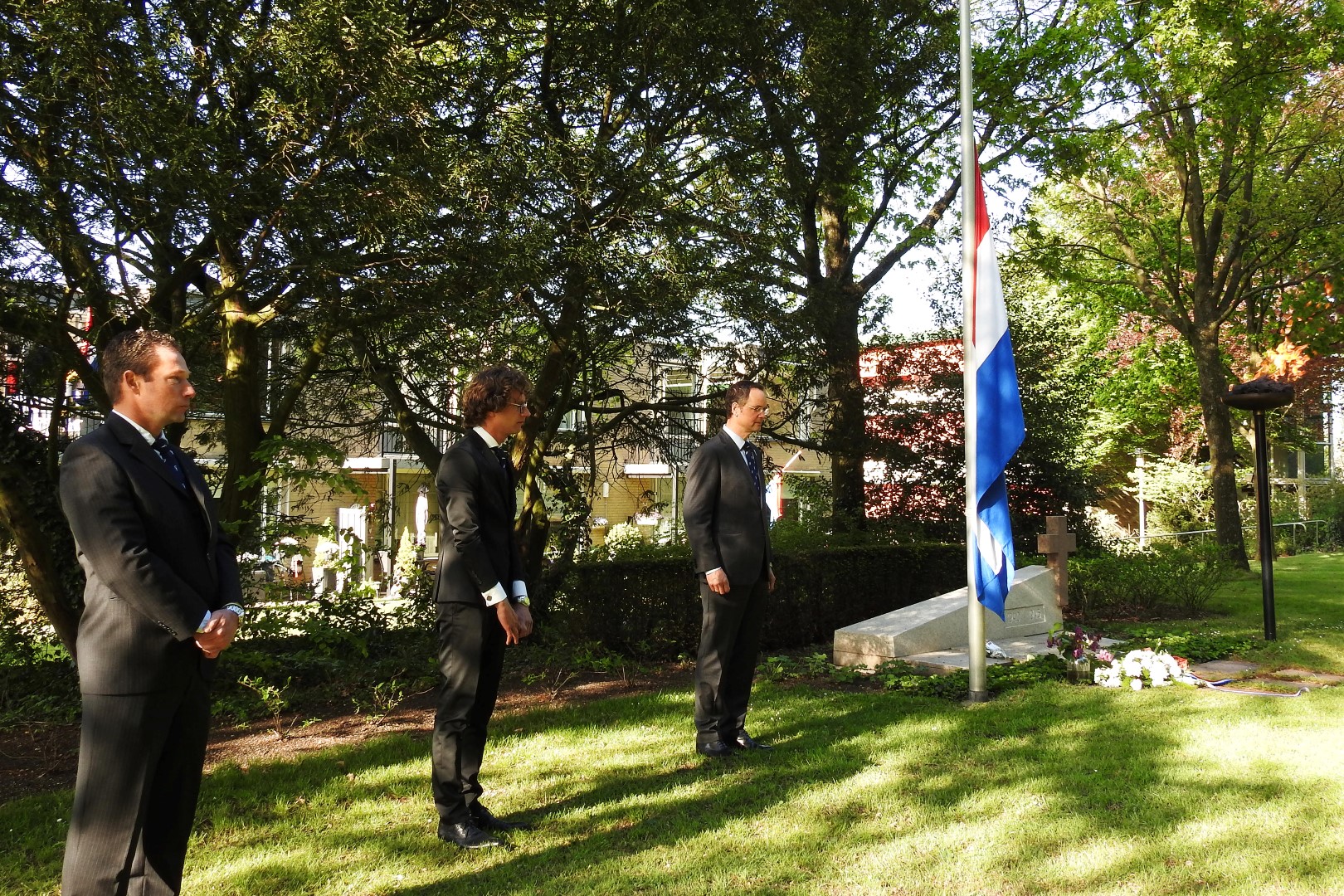 BEEKBERGEN - Op 4 mei hing in Beekbergen bij het monument in het Teixeira de Mattospark de vlag halfstok en brandde de Herdenkingsvlam. Een afvaardiging van het bestuur van de Stichting 4 en 5 mei Beekbergen legde namens iedereen een krans bij het monument. Dinsdagochtend 5 mei is het Bevrijdingsvuur vanuit Wageningen naar Beekbergen gebracht.