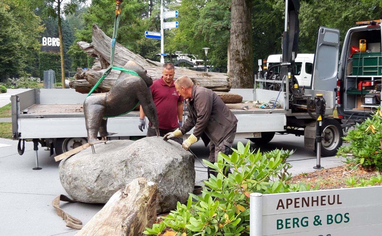 APELDOORN - Gorilla ‘Bongo’ het gezicht van Apenheul voor heel wat jaren, wordt teruggeplaatst van de Apeldoorns binnenstad naar het park Berg en Bos. Door de vernieuwing van de entree van het park Berg en Bos, moest het beeld van de Zilverrug worden verhuisd. Nu de verbouwing en het bijpassende voorplein af zijn, kan Bongo terug naar zijn oude plek. Vandaag is hij al van zijn plaats weggehaald. De werkzaamheden duren twee dagen.