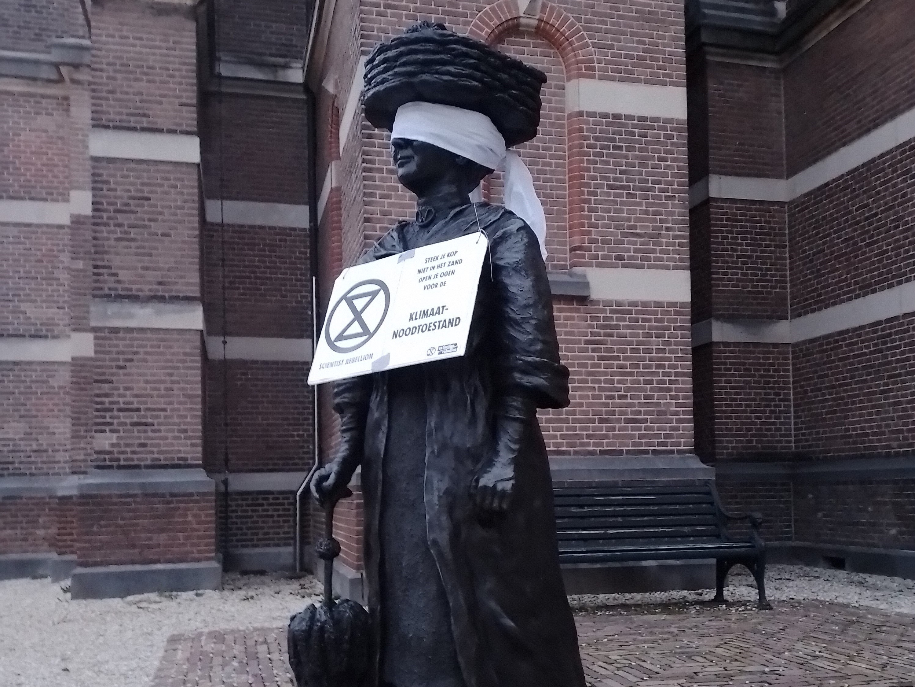 Leden van Extinction Rebellion hebben in Apeldoorn meerdere standbeelden geblinddoekt als onderdeel van een actie van Scientist Rebellion om te eisen dat er maatregelen worden genomen om verdere opwarming van de aarde te voorkomen.