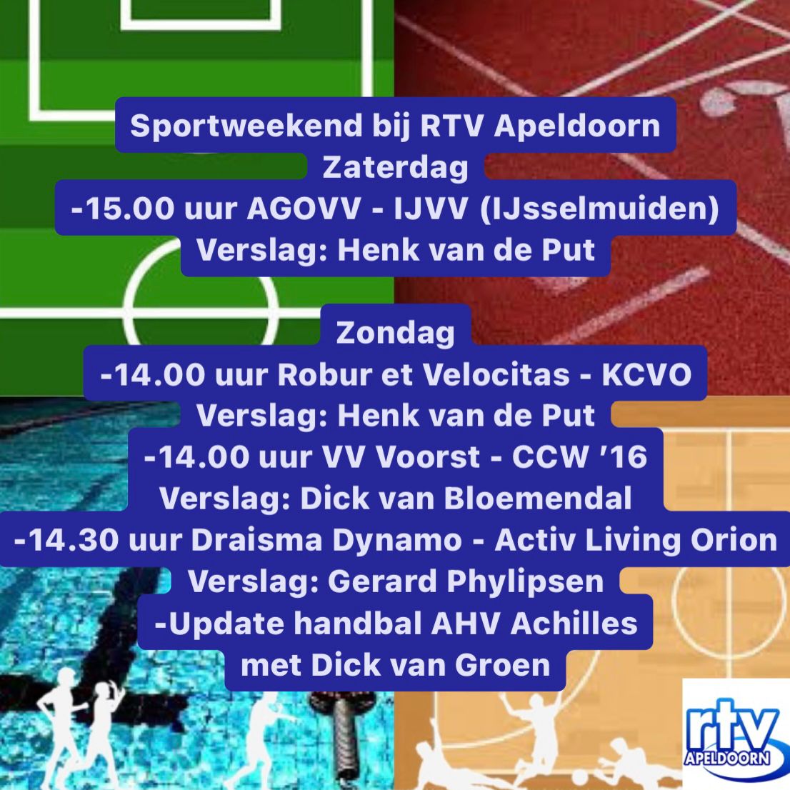 Het komende weekend bij RTV Apeldoorn besteden we weer aandacht aan verschillende sportwedstrijden. AGOVV, Robut et Velocitas, Draisma Dynamo; zomaar een greep van de clubs die je langs hoort komen.