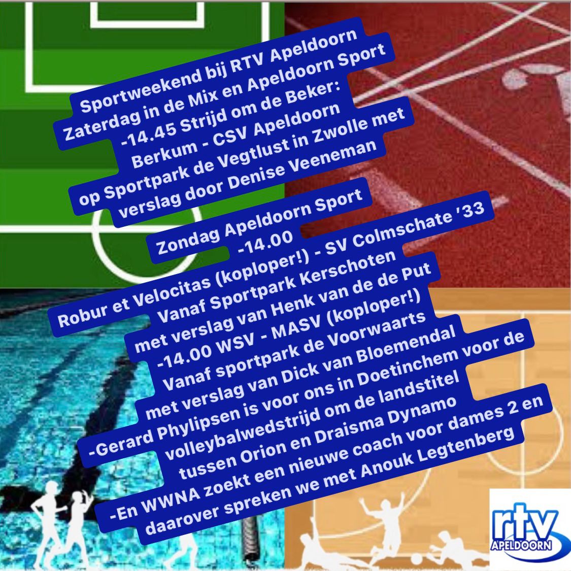 De sportverslaggevers van RTV Apeldoorn gaan het aankomende weekend weer op pad. Ze doen, zoals elke week, verslag van verschillende wedstrijden.