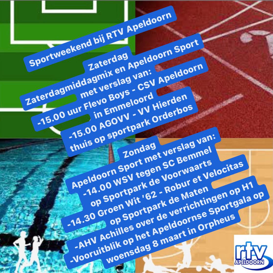 Er is weer sport bij RTV Apeldoorn komend weekend. En dus alle reden om weer te luisteren! Een uitgebreid sportprogramma met aandacht voor verschillende wedstrijden, zaterdag én zondag.