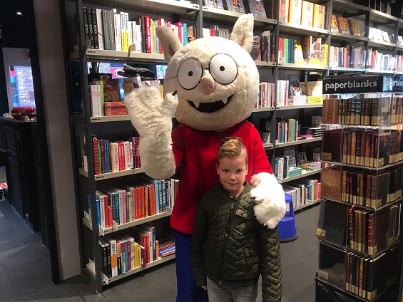 Kinderen mogen op de foto met Dolfje Weerwolfje bij boekhandel Nawijn en Polak.