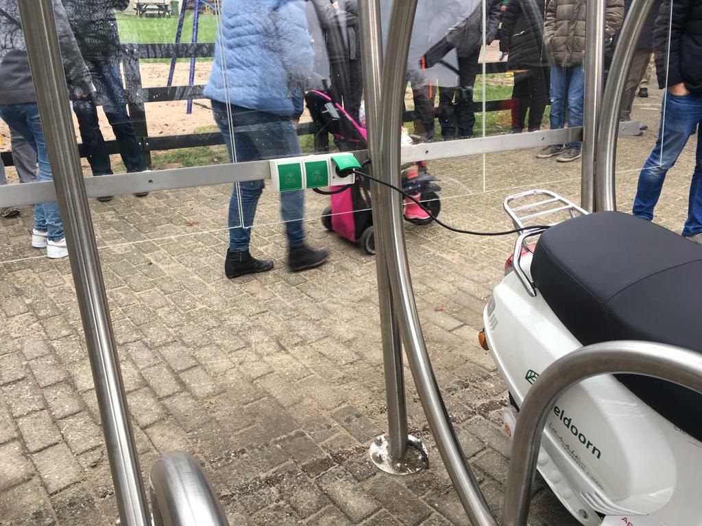 Elektrische scooter wordt opgeladen in de bijzondere fietsenstalling