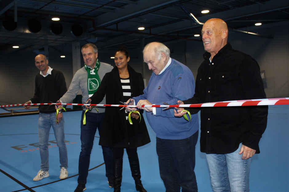 Samen met de eigenaren van het complex, Willem Goudkuil en Wilfred van Riggelen en namens FSG Chantal de Haan verrichtten AMHC-voorzitter Edgar Breed en bestuurslid zaalhockey Eric Veen de opening van de nieuwe AMHC-zaalhockeyhal.
