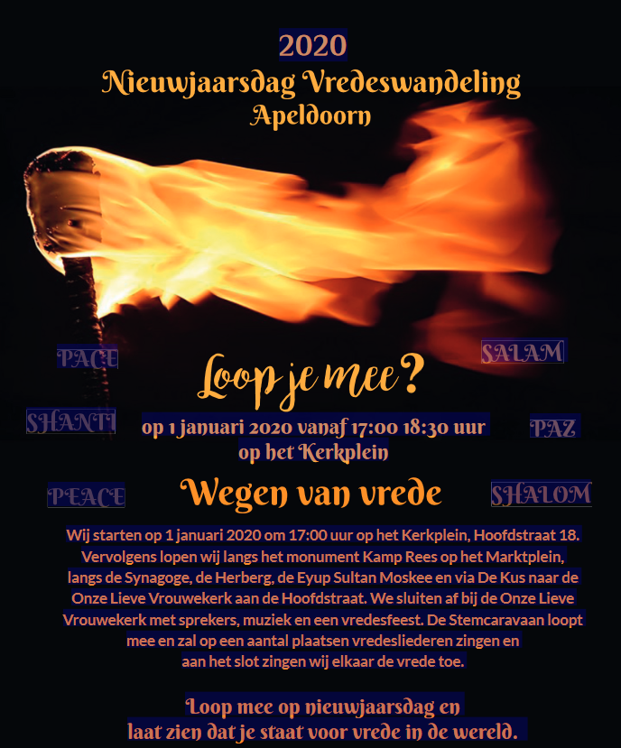 Na alle Kerstactiviteiten willen wij het nieuwe jaar beginnen met een roep om vrede. Vanaf de kerk naar monument Kamp Rees bij het gemeentehuis lopen wij met fakkels en borden van landen waar oorlog is en borden van vrede in vele talen door de stad. Onderweg laat De Stemcaravaan vredesliederen horen. De route gaat via de Synagoge in de Paslaan, de Herberg en de Eyup Sultan moskee via De Kus naar het plein bij de Onze Lieve Vrouwekerk. Daar sluiten we af met sprekers, muziek en een vredesfeest.