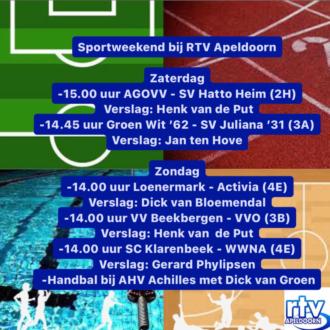 Er staat een vol sportweekend voor de deur. Uiteraard zijn de verslaggevers van RTV Apeldoorn er weer bij en kan jij vanuit je luie stoel volgen hoe de wedstrijden verlopen.