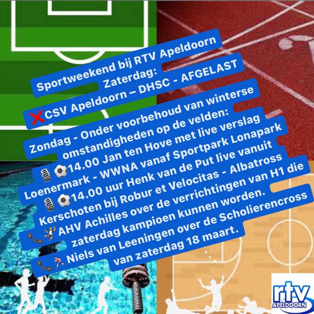 Door de winterse omstandigheden is het sportweekend even iets minder uitgebreid dan je gewend bent, maar zondag hebben we als het goed is een rijk gevuld sportprogramma bij RTV Apeldoorn. Wel even onder voorbehoud nog, maar we gaan ervan uit dat je zondag gewoon kunt luisteren naar Apeldoorn Sport.