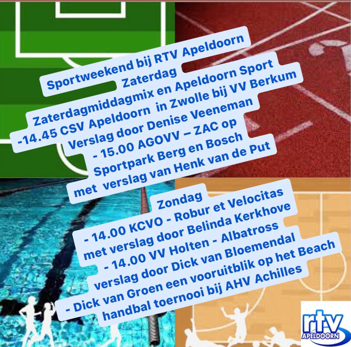Een drukke sportagenda komend weekend. Uiteraard is RTV Apeldoorn er weer live bij. Je hoort verslag in verschillende radioprogramma's.