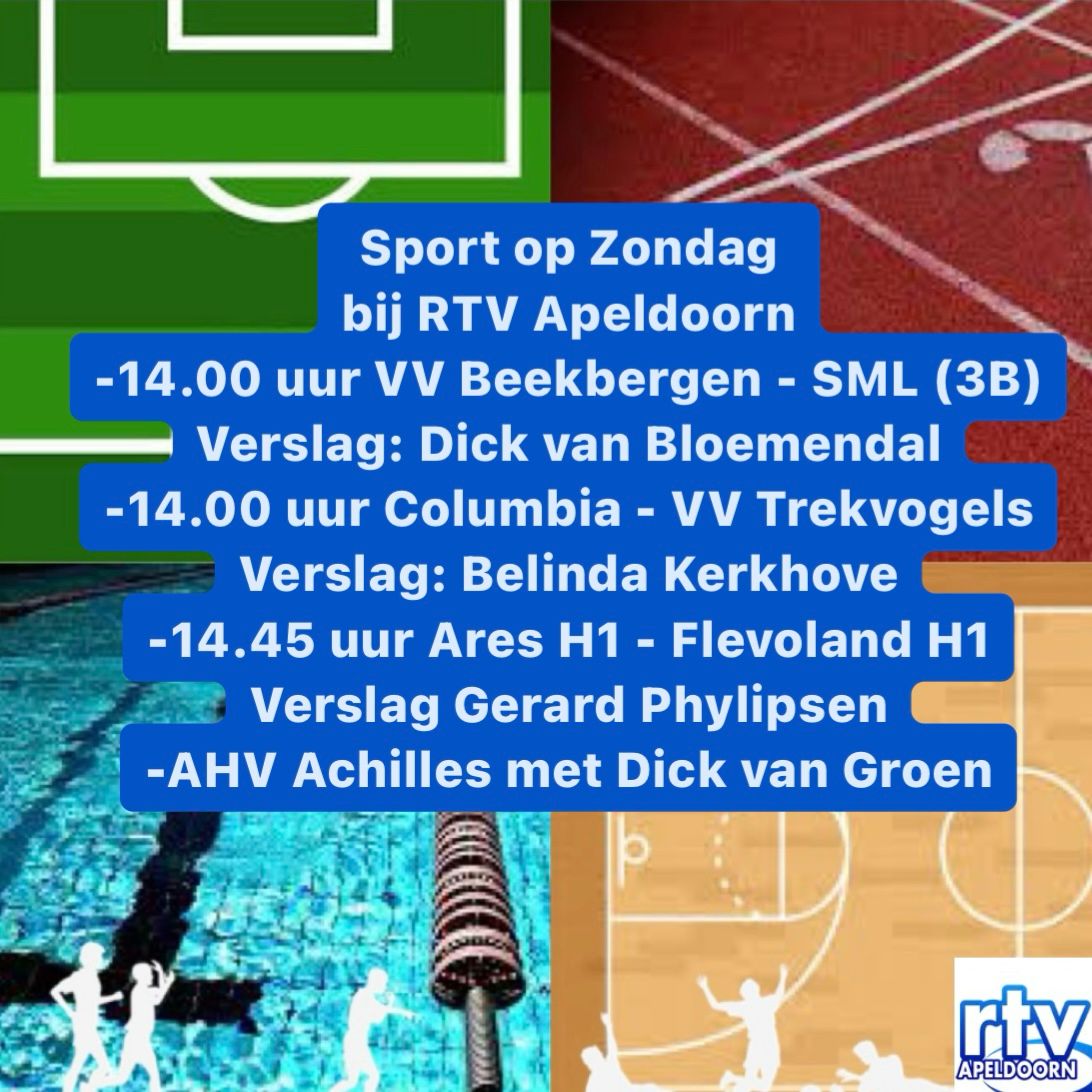 Zondag doen we verslag van de wedstrijden VV Beekbergen tegen SML (3B) met verslag van Dick van Bloemendal, start om 14.00 uur. Ook vanaf 14.00 uur doet Belinda Kerkhove verslag van de wedstrijd Columbia tegen VV Trekvogels vanuit Sportpark de Winkewijert.
