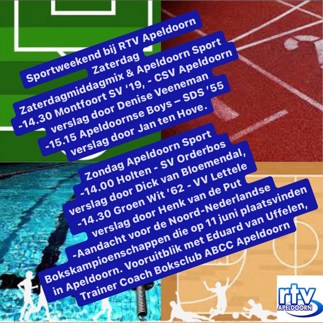 Het komende weekend bij RTV Apeldoorn besteden we weer aandacht aan de sport in Apeldoorn. Onze verslaggevers gaan weer op locatie en houden je volledig op de hoogte van de laatste ontwikkelingen.